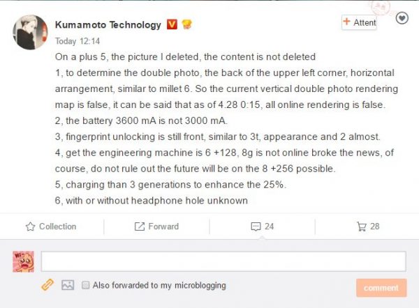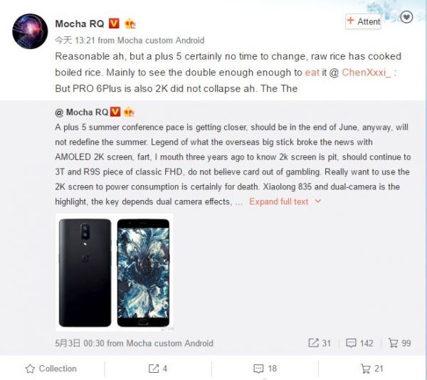 Najčerstvejšie informácie naznačujú, že pripravovaný smartfón OnePlus 5, tiež získa procesor Snapdragon 835. Predstavený by mal byť na konci júna. Predbežné informácie naznačujú, že smartfón získa 5.5 palcový displej s rozlíšením Full HD, 2K rozlíšenie použité nebude, pretože by to malo neželaný dopad na spotrebu batérie. Smartfón získa duálny fotoaparát.
