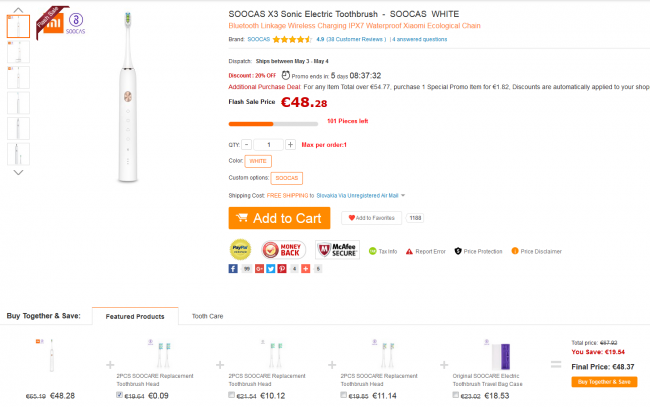 Pod produktom zubnej kefky stačí si vybrať z panelu Featured Products danú zubnú kefku a vedľa nej je balík daných nadstavcov ako vidíte na obrázku nižšie. Na koniec kliknete na Buy Together and Save.