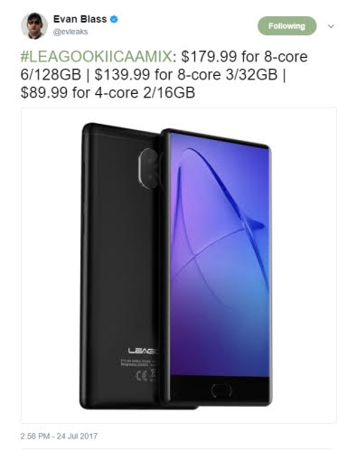 Je ním model Leagoo KIICAA MIX, ktorý príde s bezrámčekovým dizajnom podobným modelu Xiaomi Mix. Pomer obrazovky u nového modelu bude v pomere 18:9. Nový model získa 5.5 palcový displej, na prednej strane pod displejom sa bude nachádzať hardvérové tlačítko so snímačom otlačkov prstov. Na zadnej strane smartfónu nájdeme duálny fotoaparát.