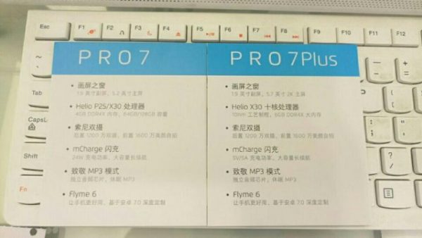 Vlajková loď Meizu Pro 7 by mal získať 5.2 palcový displej s rozlíšením Full HD, procesor MediaTek Helio P25 alebo X30, podľa varianty. Procesor X30 je výkonnejší. Smartfón získa 4GB RAM, 64GB alebo 128GB interné úložisko. Nový model získa najnovšiu možnosť rýchlonabíjania tzv. mCharge.