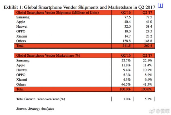 Analytická spoločnosť Strategy Analytics zverejnila zoznam najpredávanejších značiek smartfónov v tomto roku. Informáciu zverejnil aj CEO Xiaomi Lei Jun prostredníctvom čínskej sociálnej siete Weibo.