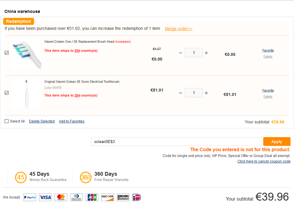 Vďaka kupónu s názvom: ocleanSE$3 cena zubnej kefky klesne na hodnotu: 39.96€. Prvých 300 kupujúcich získa zadarmo náhradný nadstavec. Ak zubnú kefku vložíte do košíka, nadstavec sa k zubnej kefke tiež v nákupnom košíku pridá. Následne uplatníte zľavový kupón a cena zubnej kefky sa zníži.