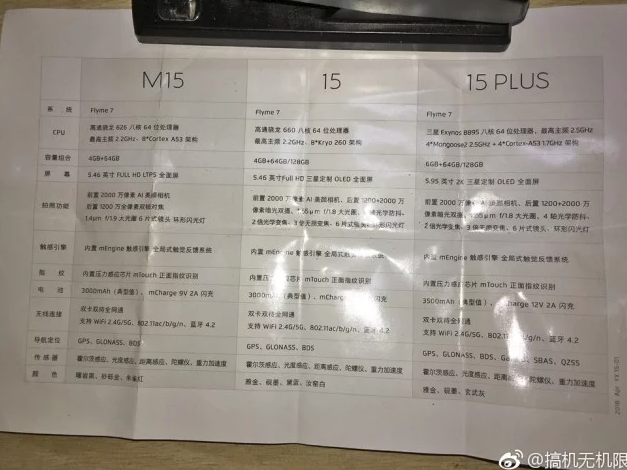 Samrtfón Meizu 15 získa 5.46 palcový OLED displej s rozlíšením Full HD. Procesorom smartfónu má byť Snadragon 660, nebude chýbať RAM s kapacitou 4GB, interné úložisko s kapacitou 64GB, alebo 128GB. Hlavný fotoaparát nový model získa duálny 20 a 12 megapixelový. Kapacita batérie bude dosahovať úroveň 3000 mAh, ktorá bude podporovať technológiu rýchlonabíjania mCharge.
