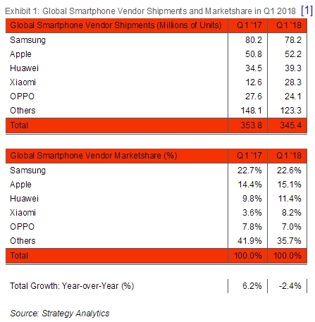 V porovnaní s predchádzajúcim rokom za prvý kvartál celková predajnosť smartfónov po celkom svete klesla o 2.4% na 345,3 milióna predaných kusov.