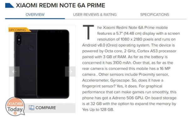 Na internete sa objavili špecifikácie pripravovaného smartfónu Xiaomi Redmi Note 6A, ktorý príde na trh pravdepodobne v podobnom termíne ako predchádzajúci model 5A. Tentorkát model Xiaomi Redmi Note 6A získa 5.7 palcový displej s rozlíšením Full HD+, ako u mnoho nových smartfónov displej získa pomer 18:9. Oproti pôvodnému modelu 5A, ktorý obsahuje procesor Snapdragon 425, nový model 6A získa procesor Snapdragon 625, nebude chýbať RAM s kapacitou 3GB, interné úložisko s kapacitou 32GB, ktoré bude možné rozšíriť prostredníctvom Micro SD kariet.