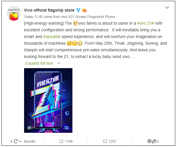 Spoločnosť prostredníctvom čínskej sociálnej siete Weibo zverejnila upútavku na predstavenie prvého modelu série Z, Vivo Z1. Smartfón sa do predaja dostane zajtra. Táto séria bude strednou triedou smartfónov. Nový model získa displej s výrezom, displej nového modelu bude pokrývať 90% prednej plochy smartfónu, bude v pomere 19:9. Zatiaľ nie sú bližšie presné špecifikácie nového modelu.