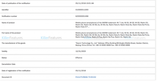 Xiaomi Redmi S1, Xiaomi Redmi S2 – ktorý už bol predstavený, Xiaomi Redmi S3, taktiež sa v zozname objavil Xiaomi Redmi Note 6, Xiaomi Redmi Note 6A / jeho verzia Prime, ktorá bude pravdepodobne výkonnejšou variantou.