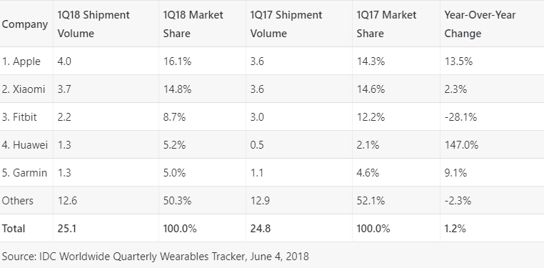 Na 1. mieste sa nachádza spoločnosť Apple so 4 miliónmi predaných hodiniek Apple Watch, kedy spoločnosť dosahuje 16.1% podiel na trhu. Na druhom mieste sa nachádza spoločnosť Xiaomi s 3.7 miliónmi predaných náramkov Xiaomi Band, so 14.8% podielom na trhu.