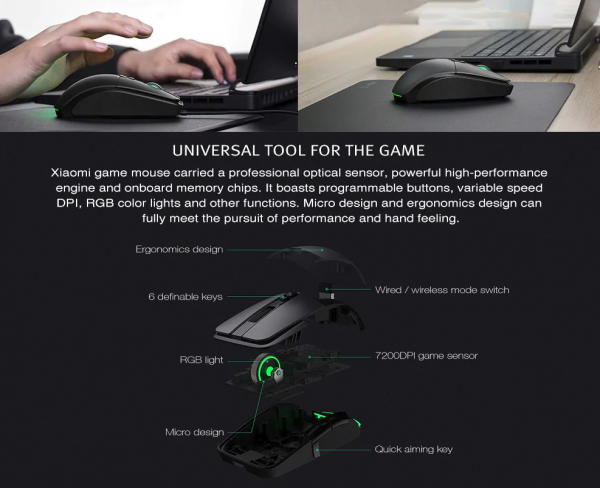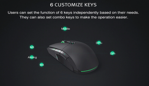 Hernú myšku je možné používať v drôtovej verzií, určenej pre hráčov, alebo v bezdrôtovej verzií určenou skôr pre kancelárske práce. Myška obsahuje optický senzor na úrovni 7200 dpi, možné je nastaviť päť rýchlostí. Taktiež myška obsahuje LED svietenie s možnosťami výberu štyroch farebných osvetlení.