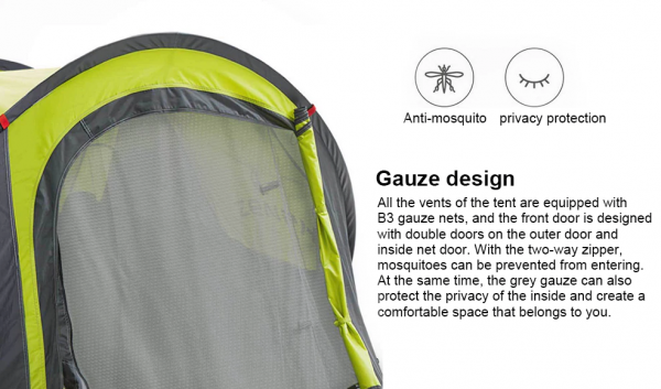 Stan je vhodný prep 3 – 4 osoby a je ho možné rozložiť už za 3 sekundy. Stanu taktiež nechýba vodeodolnosť.