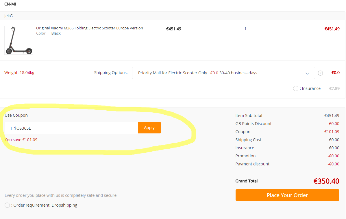 cena klesne na hodnotu: 350.40€. V cene sú zahrnuté všetky poplatky, poštovné Priority Mail for Electric Scooter Only je zadarmo. Ďalšie poplatky navyše pri doručení (CLO/DPH) neplatíte.