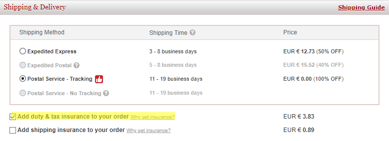 Možný je výber aj pripoistenia voči colným poplatkom v sume 3.83€. Čiže ak by balík skončil na colnici e-shop Vám tieto poplatky preplatí. Potrebné je kontaktovať e-shop, alebo nás v online podpore a my dokumenty z colnice zašleme do e-shopu na refundáciu.