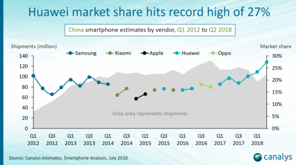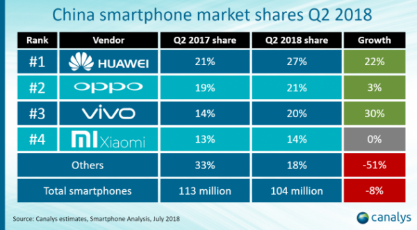 Veľmi výrazný úspech zaznamenala spoločnosť Vivo, ktorá dokázala medziročne zvýšiť predaje svojich smartfónov o 30% v porovnaní s rovnakým obdobím minulého roku. Na prvom mieste sa nachádza spoločnosť Huawei, ktorej predaje sa zvýšili o 22% v porovnaní s minulým rokom. Spoločnosť Oppo mala nízky nárast predaja na úrovni 3%. Spoločnosť Xiaomi je v predajnosti smartfónov momentálne na rovnakej úrovni za 2 kvartál v porovnaní s rovnakým obdobím minulého roku. Lepšie predaje budú v 3. kvartáli, keďže sa nové smartfóny dostali do predaja.