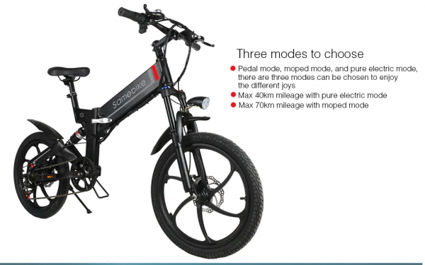 Elektrobicykel Samebike obsahuje 350W elektromotor, vďaka ktorému je možný až 70km dojazd v režime moped, 40 km dojazd v plnom elektrickom režime v plnej rýchlosti. Maximálna rýchlosť bicykla je na úrovni až 35 km / h. K produktu je dodávaný EU adaptér.