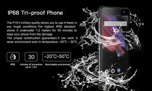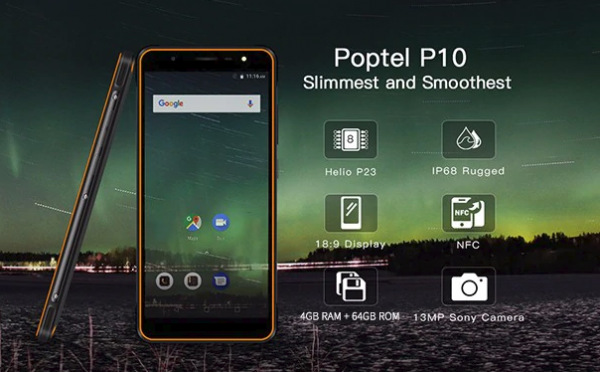 Poptel P10 získava 5.5 palcový displej. Procesorom smartfónu je Mediatek MTK6763, nechýba 4GB RAM, interné úložisko s kapacitou 64GB. Uvedený model získava 13 megapixelový fotoaparát, predný fotoaprát 8 megapixelový. Smartfónu nechýba plná podpora LTE sietí, slovenčina. Taktiež obsahuje vodotesnosť IP68, vďaka ktorej je smartfón vodotesný do hĺbky 1.2 metra po dobu 30. minút. Kapacita batérie dosahuje úroveň 3600 mAh.