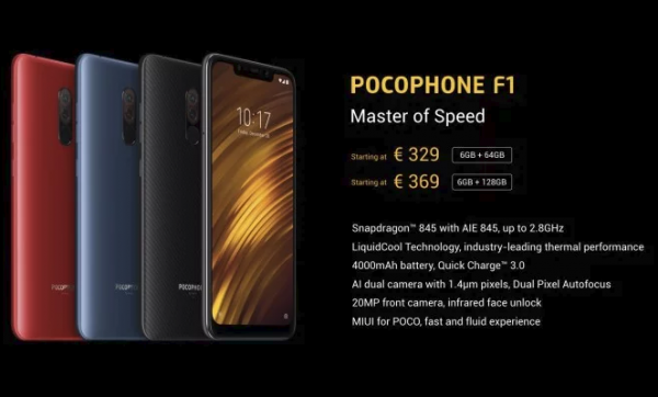 Smartfón Poco F1 získava 6.18 palcový displej s rozlíšením Full HD+ v pomere 18.7 : 9. Procesorom nového smartfónu je Snapdragon 845, nechýba RAM s kapacitou 6alebo 8GB, interné úložisko s kapacitou 64, 128, alebo 256GB. Interné úložisko je možné rozšíriť prostredníctvom Micro SD kariet. Operačným systémom smarfónu je Android 8.1 s upravenou nadstavbou systému MIUI – nadstavba obsahuje launcher Poco určený pre tento model smartfónu. Aktuálizácia na nový systém Android P bude dostupná v 4. kvartáli tohto roku.