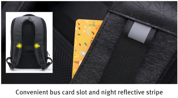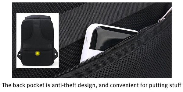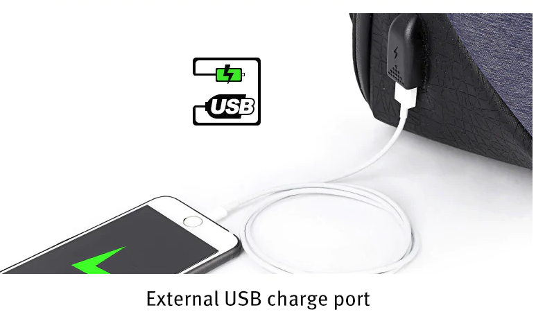 Batoh má odolnosť voči vode – premoknutiu, taktiež obsahuje USB výstup vďaka ktorému z vnútornej strany môžete umiestniť powerbanku pre nabíjenie smarfónu.