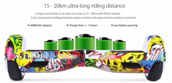 Hoverboard dosahuje maximálnu rýchlosť 20 km/h, dojazd na jedno nabitie je na úrovni 15 – 20 km. Ak batéria klesne pod 10% percent, hoverboard upozorní zvukovým signálom.