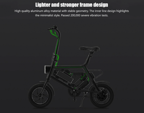 Nový bicykel je ľahko skladateľný a váži približne 16.7 kg. Rám je vyrobený z hliníkovej zliatiny špeciálne skonštruovanej tak, aby vydržala namáhanie aj motora a batérie, ktoré sa nachádzajú v strednej časti rámu. Bicykel obsahuje vysoko účinný kotúčový brzdový systém s brzdným účinkom 4 metrov na suchom povrchu, 6 metrov na mokrom povrchu. Sedadlo je vyrobené z nepremokavého penového poťahu. Maximálna rýchlosť bicykla sa pohybuje na úrovni 20 km / h, pričom maximálna záťaž je na úrovni 100 kg.