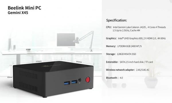 Mini počítač Beelink Gemini X45 Premium získava procesor Intel Gemini Lake Celeron J4105 s grafikou Intel HD Graphic 600. Počítač obsahuje 4GB RAM, 128GB SSD úložisko, ktoré je možné rozšíriť o 2.5 palcový disk. K notebooku je dodávaný operačný systém Windows 10 s licenciou. Uvedenému modelu nechýba slot pre Micro SD karty, zabudovaná Wifi, ethernet, USB 3.0 porty, audio jack, HDMI port, DC napájací port.