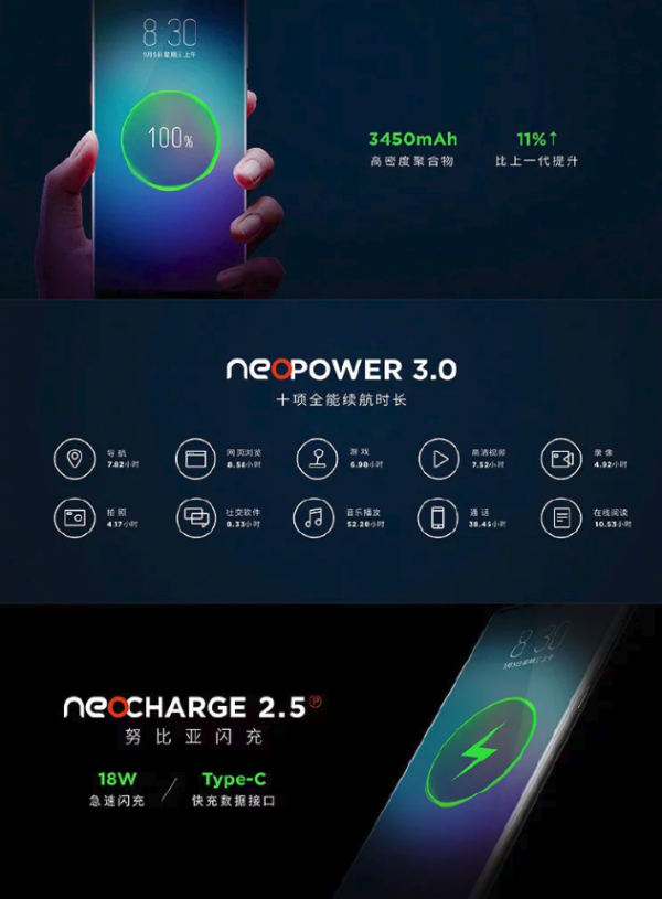 Hlavný fotoaparát nový model získava duálny 24 a 16 megapixelový, predný fotoaparát smartfón získava 8 megapixelový. Nechýba podpora umelej inteligencie pri fotografovaní. Kapacita batérie nového modelu dosahuje úroveň 3450 mAh. Smartfón podporuje technológiu rýchlonabíjania s názvom NeoCharge 2.5.