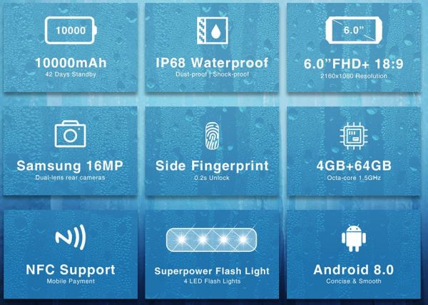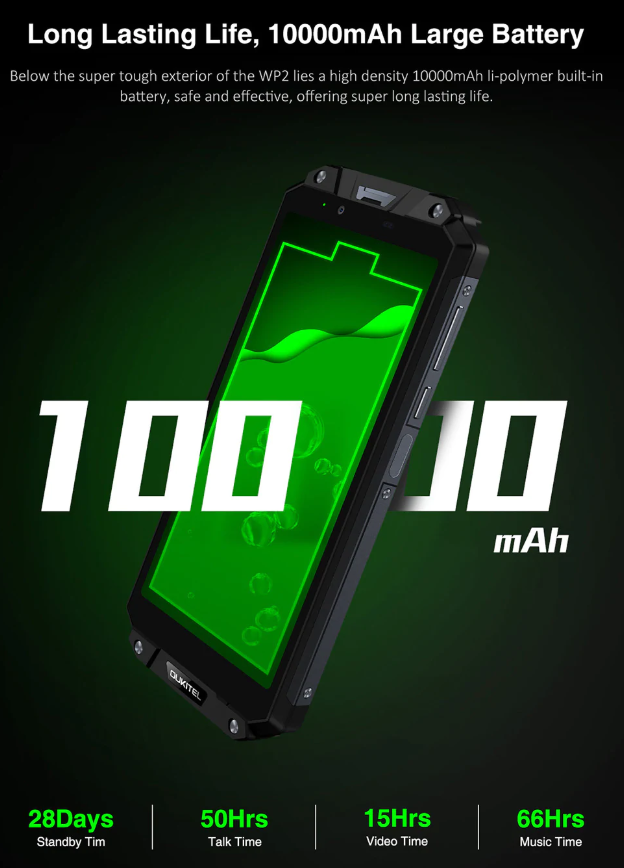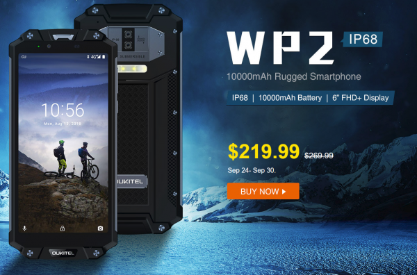 Smartfón Oukitel WP2 získava 6 palcový displej s rozlíšením Full HD+. Procesorom smartfónu je Mediatek MTK6750T, nechýba RAM s kapacitou 4GB, interné úložisko s kapacitou 64GB. Nový model získava hlavný fotoaparát duálny 16 a 2 megapixelový, predný fotoaparát 8 megapixelový. Kapacita batérie dosahuje úroveň 10 000 mAh, ktorá zaručuje pohotovostný režim približne 18 dní. Snímač otlačkov prstov smartfón obsahuje na bočnej strane. Uvedenému modelu nechýba NFC modul pre platby, taktiež smartfón obsahuje plnú podporu LTE sietí, nechýba slovenčina. Smartfón je nárazuvzdorný, vodotesný s certifikáciou IP68 (do hĺbky 1m po dobu 30. min).