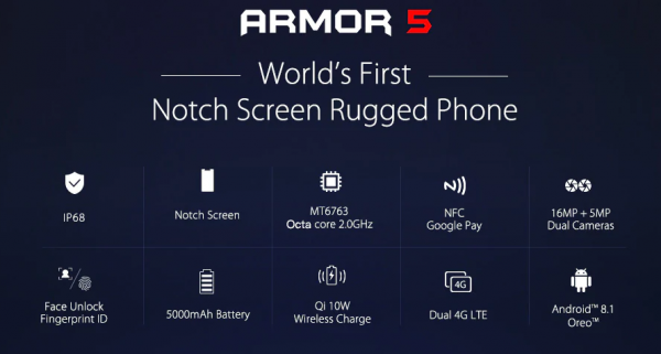 Smartfón Ulefone Armor 5 získava 5.85 palcový displej s rozlíšením 1512 x 720 pixelov. Procesorom smartfónu je Mediatek MTK6763 taktovaný na frekvenciu 2 GHz, nechýba RAM s kapacitou 4GB, interné úložisko s kapacitou 64GB. Hlavný fotoaparát smartfón obsahuje duálny 16 a 5 megapixelový, predný fotoaparát 13 megapixelový. Kapacita batérie dosahuje úroveň skvelých 5000 mAh.