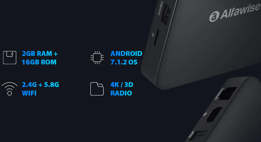 Uvedenému modelu nechýba v balení EU adaptér, box obsahuje wifi, ethernet, bluetooth, operačným systémom je Android 7.1.2.