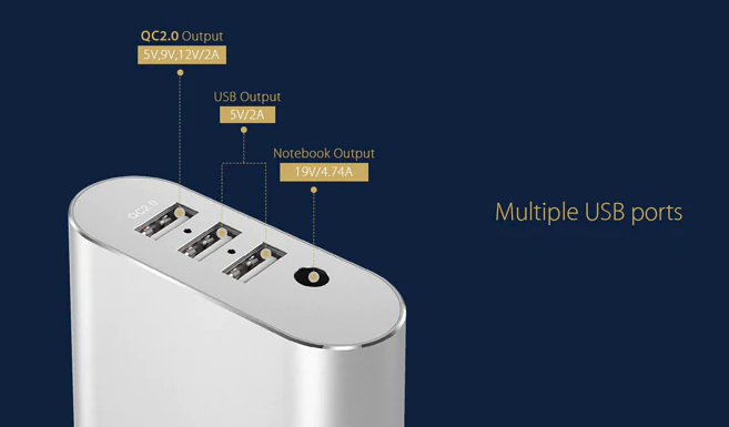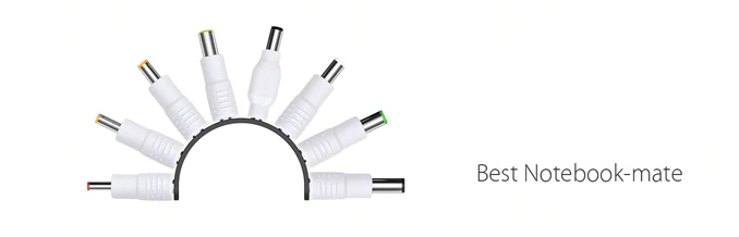 V balení sa nachádza množstvo nadstavcov pre nabíjanie rôznych značiek notebookov. Výhodou je priamo napojenie do adaptéru, ktorý obsahuje aj USB porty pre nabíjanie ostatných zariadení.