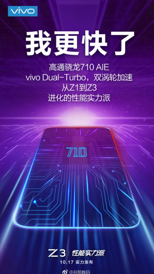 Spoločnosť Vivo už 17. októbra plánuje predstaviť smartfón Vivo Z3, ktorý získa 6.3 palcový displej s rozlíšením Full HD+. Smartfón získa procesor Snapdragon 710, nebude chýbať RAM s kapacitou 4GB, interné úložisko s kapacitou 64GB. Nový model získa batériu s kapacitou 3 240 mAh, Smartfón získa tzv. technológiu Dual Turbo, ktorá zvyšuje výkon systému a načítavania aplikácii rýchlejšie. Smartfón pobeží na operačnej nadstavbe FunTouch OS, bežiacej na Androide 8.1. Hlavný fotpaparát nový model získa duálny 16 a 2 megapixelový, predný fotoaparát smartfón získa 12 megapixelový.