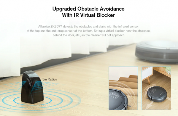 K uvedenému modelu je v balení tzv. blocker, čiže prekážka, ktorú vysávač považuje za stenu. Vhodné to je umiestniť napr. medzi zárubne dverí, ak chcete vysávať len konkrétnu miestnosť.