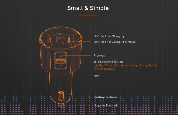 Transmitter funguje spôsobom kedy smartfón spárujete s transmitterom na základe bluetooth pripojenia. Uvedenú frekvenciu, ktorá je na transmitteri nastavíte na autorádiu. Tým pádom prebieha bezdrôtový prenos hudby do autorádia. Čiže možné je prehrávať skladby zo smartfónu, alebo takatiež je možné prehrávať skladby z USB kľúča, ktorý pripojíte do transmittera.