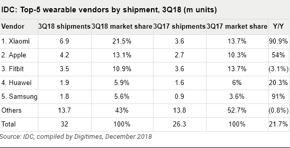 Na 1. mieste sa nachádza spoločnosť Xiaomi s podielom 21.5% nositeľných zariadení, v porovnaní s rovnakým obdobím minulého roku s 13.7% podielom na trhu, nárast predaja produktov bol až o 90.9%, z 3.6 milióna predaných kusov až na 6.9 milióna.