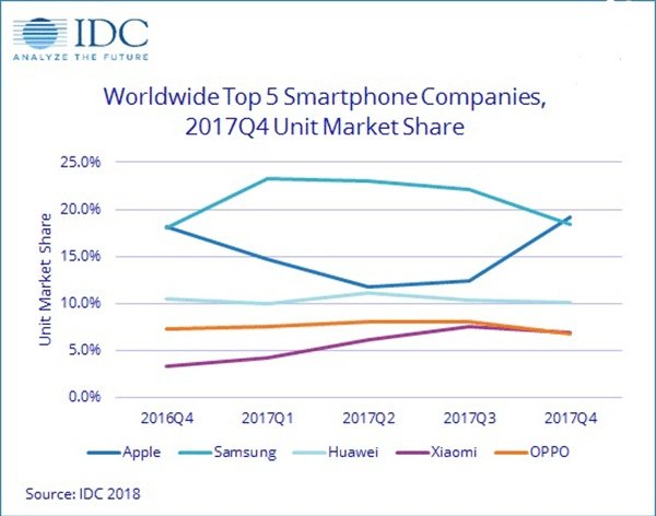 Spoločnosť Apple za štvrtý kvartál dodala 77.3 milióna smartfónov. Spoločnosť Samsung dodala 74.1 milióna smartfónov. Spoločnosť Huawei dodala 41 milióna kusov smartfónov. Oproti prechádzajúcemu roku tieto spoločnosti zaznamenali pokles predaja smartfónov v rovnakom období.