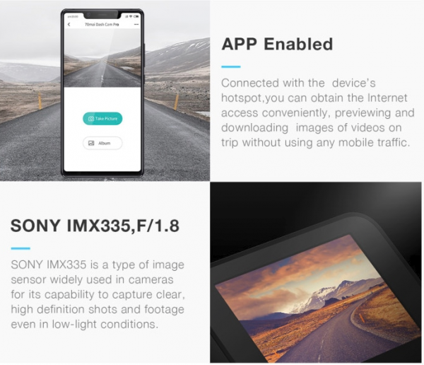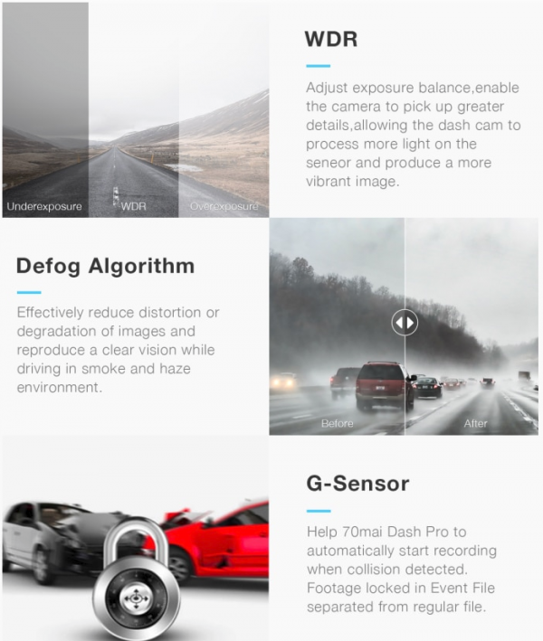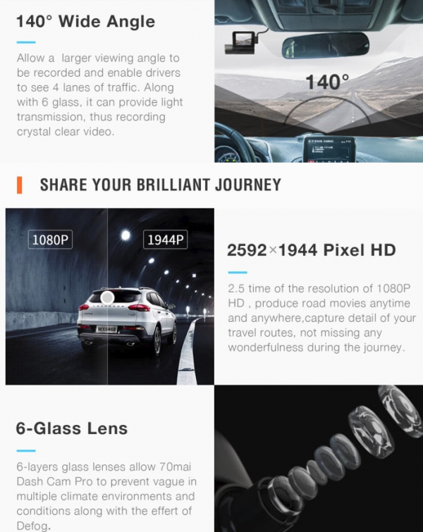 Kamerka Xiaomi 70mai Dash Cam Pro je priamo určená pre EU trhy, kedy obsahuje angličtinu. Rozlíšenie záznamu je na úrovni 2592 x 1944 pixelov, kamerke taktiež nechýba displej, automatické spustenie pri naštartovaní auta, videá sú automaticky premazávané, ak je plná Micro SD karta. Kamerke taktiež nechýba spárovanie s aplikáciou v smartfóne, taktiež 24 h monitoring priestoru pred automobilom – ak je zaznamenaný náraz kamerka sa automaticky zapne, taktiež pripomienka ak sa automobil zapne. Počas jazdy kamerka taktiež upozorní na potencionálne nebezpečenstvo.
