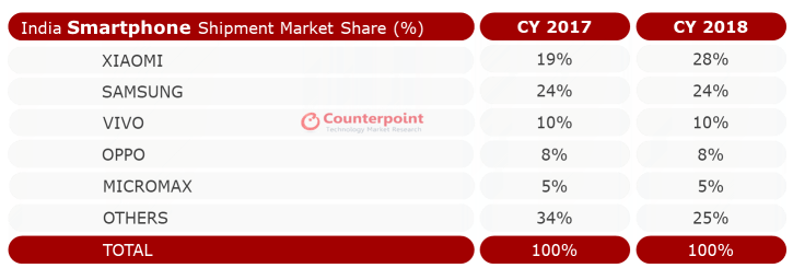 V porovnaní s rokom 2017, kedy spoločnosť Xiaomi mala na indickom trhu 19% podiel predajnosti smartfónov, v minulom roku sa tento podiel zvýžil na 28%, čím smartfóny spoločnosti Xiaomi sa stali najpredávanejšie. V roku 2017 spoločnosť Samsung na indickom trhu mala podiel na úrovni 24%, kedy bola na 1. mieste, no v minulom roku túto spoločnosť z 1. miesta zosadila spoločnosť Xiaomi.