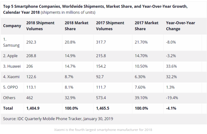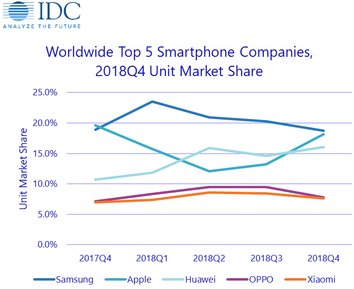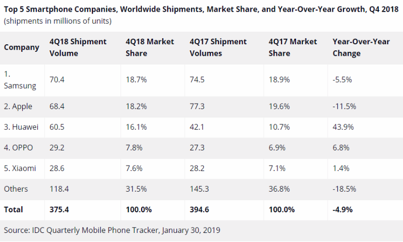 V 4. kvartáli minulého roku spoločnosť Samsung dodala celosvetovo naviac smartfónov na úrovni 70.4 milióna kusov. V porovnaní so 4. kvartálom roku 2017 predaje boli o 5.5% nižšie. Spoločnosť Apple dodala v 4. kvaráli minulého roku 68.4 milióna kusov smartfónov. V porovnaní zo 4. kvartálom roku 2017 to bol 11.5% pokles predaja. Spoločnosť Huawei si v 4. kvartáli minulého roku polepšila až o 43.9% v porovnaní so 4. kvartálom roku 2017. Spoločnosť Oppo zaznamenala taktiež vyššie predaje o 6.8% v porovnaní so 4. kvartálom roku 2017. Spoločnosť Xiaomi v 4. kvartáli minulého roku dodala 28.6 milióna smartfónov, čo je o 400 000 kusov viac ako v 4. kvartáli roku 2017.