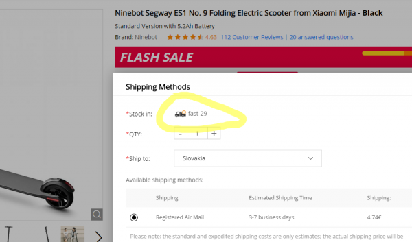 Cena kolobežky v španielskom sklade s označením FAST-29 bola znížená na hodnotu 309.40€. Poštovné je v cene 4.79€ s dobou doručenia 3 – 7 dní. Keďže sa produkt nachádza v španielskom sklade, ďalšie poplatky navyše pri doručení neplatíte. Na stránke Gearbestu po rozkliknutí možnosti Shipping sa zobrazí v ktorom sklade sa kolobežka nachádza, je to španielský sklad.