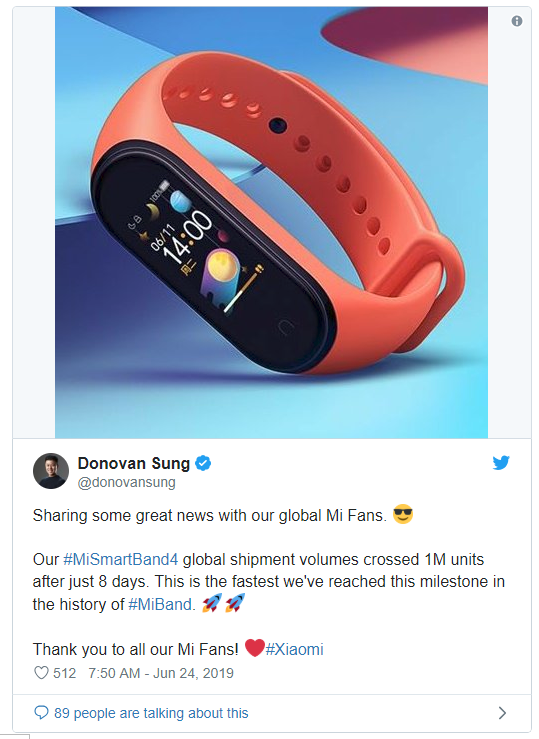 Viceprezident spoločnosti Xiaomi Donovan Sung prostredníctvom Twitteru oznámil veľmi potešujúcu správu. Nový náramok je v predajoch neuveriteľne úspešný a je najrýchlejšie predávajúcim Mi Band náramkom. Za krátkych 8 dní spoločnosť predala neuveriteľný 1 milión kusov nového náramku.