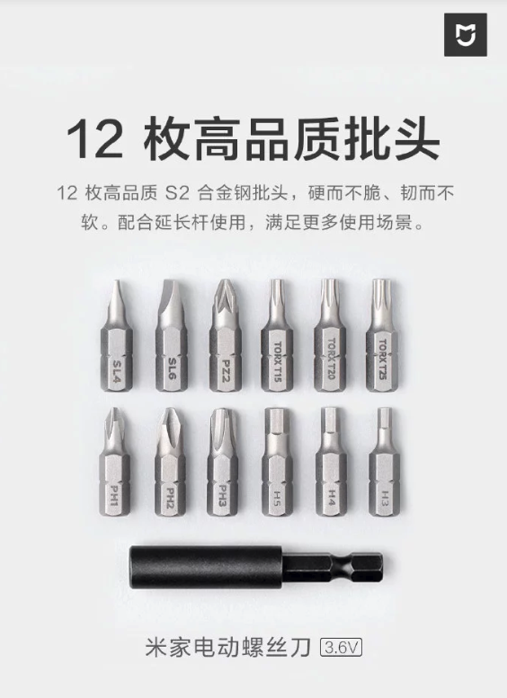 Novému skrutkovaču v balení nechýba 12 nadstavcov, obsahuje integrovanú dobíjateľnú batériu s kapacitou 2 000 mAh, ktorá sa nabíja prostredníctvom káblika typu USB C. Pri výrobe nadstavcov bola použitá oceľ typu S2, ktorá zaručuje lepšiu húževnatosť a nedá sa len tak ľahko zlomiť aj pri nevhodnom používaní. Táto oceľ je odolnejšia v porovnaní s chrómovou oceľou, až o 20% vyššou životnosťou.