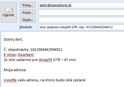 Do tela e-mailu nezabudnite uviesť, č. objednávky, e-shop v ktorom ste nakúpili, ideálne aj dátum objednávky, ideálne aj e-mail s ktorým ste registrovaný v e-shope, určite adresu, na ktorú sklá zašleme.