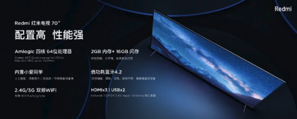 Redmi Tv získava uhlopriečku na úrovni 70 palcov / 177 cm, so 4K rozlíšením. V porovnaní s 55 palcovými uhlopriečkami je až o 60% širšia. Poháňa ju 64 gbitový štvorjadrový procesor Amlogic taktovaný na frekvenciu 1.5 GHz, s grafickým adaptérom Mali-450 MP3. Jej RAM je na úrovni 2GB, interné úložisko na úrovni 16GB. Obsahuje tri HDMI porty, dva USB porty, nechýba Wifi, aj bluetooth. Rovnako ako u Xiaomi Tv nechýba aj podpora hlasového asistenta XioAl. Operačný systém je rovnaký, ako u Xiaomi Tv, PatchWall. Kvalitná audio sústava nechýba Dolby Audio, či DTS-HD audio.