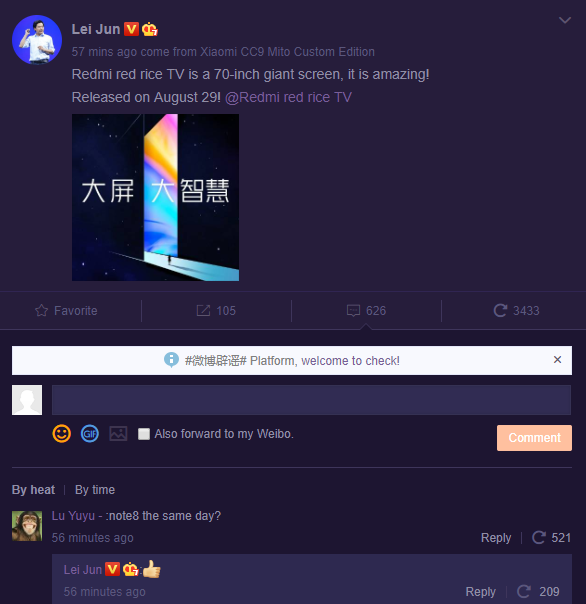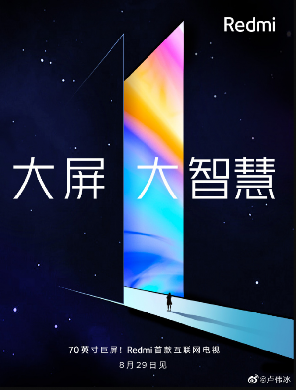 Už 29. augusta spoločnosť predstaví vlastnú Tv, ktorá má získať uhlopriečku až 177 cm. Okrem televízie prostredníctom čínskej sociálnej siete Weibo, generálny riaditeľ Xiaomi nenápadne potvrdil aj predstavenie nového modelu Redmi Note 8.