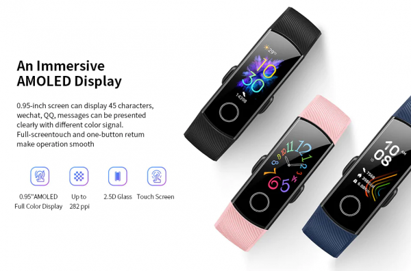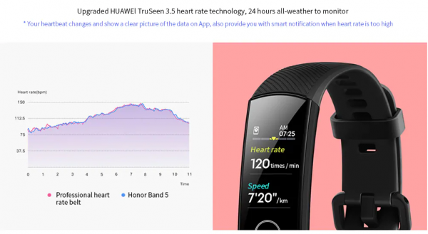 Náramok Honor Band 5 získava 0.95 palcový AMOLED displej s rozlíšením 240 x 120 pixelov. Náramku nechýba snímač tepu s neustálym monitorovaním tepu počas 24. hodín. Náramku nechýba novšia technológia Bluetooth vo verzii 5.0, ktorá zaručuje väčší, silnejší dosah prepojenia so smartfónom, synchronizácia so smartfónom je výrazne rýchlejšia ako u predchádzajúceho modelu náramku. Náramku nechýba certifikácia 5ATM, vďaka ktorej je vodotesný do hĺbky 50 metrov. Jeho výdrž je na úrovni 14 dní bez automaticky nastaveného monitorovania tepu, s automaticky nastavením monitorovania tepu je výdrž na úrovni približne 6 dní.