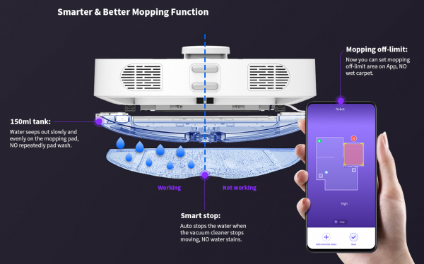 Na jedno nabitie vysávač vydrží približne hodinu a pol vysávania. Ak je batéria na nízkej úrovni, aj tento vysávač sa automaticky napojí na dock nabíjaciu stanicu. Vysávač bez problémov prekoná aj prahové lišty do výšky 2 cm. Uvedený model taktiež obsahuje funkciu umývania vodou – obsahuje zásobník na vodu so zvýšenou kapacitou 150 ml, zásobník na odpad má kapacitu na úrovni 570 ml. Jeho výkon je na úrovni 2000 Pa.