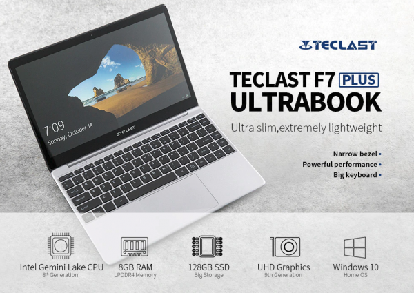 Ultrabook Teclast F7 Plus získava 14 palcový displej s rozlíšením Full HD. Procesorom notebooku je Intel Gemini Lake N4100 s Turbo Boost až do frekvencie 2.4 GHz. Novému ultrabooku nechýba interné úložisko typu SSD s kapacitou 256GB, RAM na úrovni 8GB. Predný fotoaprarát ultrabook obsahuje 2 megapixelový. Nechýba mu podsvietená klávesnica, 2x USB 3.0, audio jack, DC Jack, slot pre Micro SD karty, Mini HDMI port. Jeho logo na zadnej strane svieti.