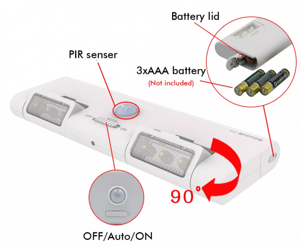 Senzor svetla má dosah 3 metre, kedy po detekovaní pohybu sa počas tmy zapne. Ak senzor pohyb nedetekuje vypne sa za dobu 15. sekúnd. Senzor je napájaný 3x AAA batériami.
