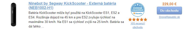 Externá batéria je určená pre Ninebot ES2 kolobežku, kedy sa zvýši dojazd z 30 kilometrov, na 45 km s batériou. Rýchlosť sa zvýši z 25 km / hod, na 30 km / hod.