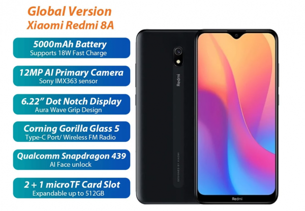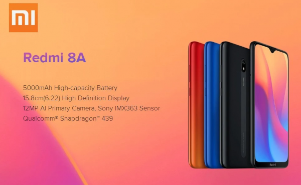 Smartfón Redmi 8A získava 6.22 palcový displej s rozlíšením HD+, ktoré chráni odolné sklo Gorilla Glass 5. generácie, displej získava pomer na úrovni 19:9. Procesorom smartfónu je Snapdragon 439, nechýba RAM s kapacitou 2GB, interné úložisko s kapacitou 32GB, ktoré je možné rozšíriť prostredníctvom Micro SD kariet. Hlavný fotoaparát smartfón získava 12 megapixelový, predný fotoaparát 8 megapixelový. Kapacita batérie dosahuje úroveň až 5000 mAh, na nabíjanie slúži dokonca port typu USB C. Smartfón obsahuje 3.5 mm audio jack, dokonca obsahuje aj rádio, ktoré funguje bez potreby pripájania slúchadiel. Nechýba funkcia odomknutia smartfónu na základe rozpoznávania tváre majiteľa.