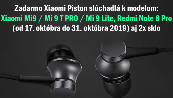 - Xiaomi Piston slúchadlá zadarmo platia pre objednávky modelov Xiaomi Mi9, Xiaomi Mi 9 T Pro, Xiaomi Mi 9 Lite, Redmi Note 8 Pro v termíne od 17.10. 2019 21:00 hod. – do termínu 31.10.2019.